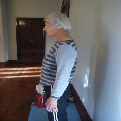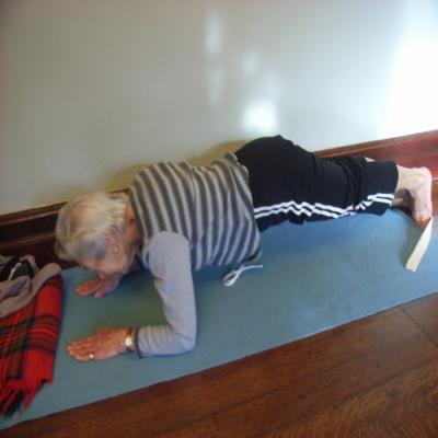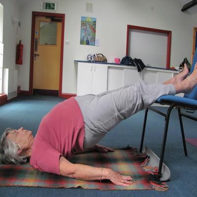 The Bridge enables the student to relax in a position which helps open out the chest. This is really helpful for a person with osteoporosis because the shoulders tend to start rolling forward and dropping which makes breathing harder.